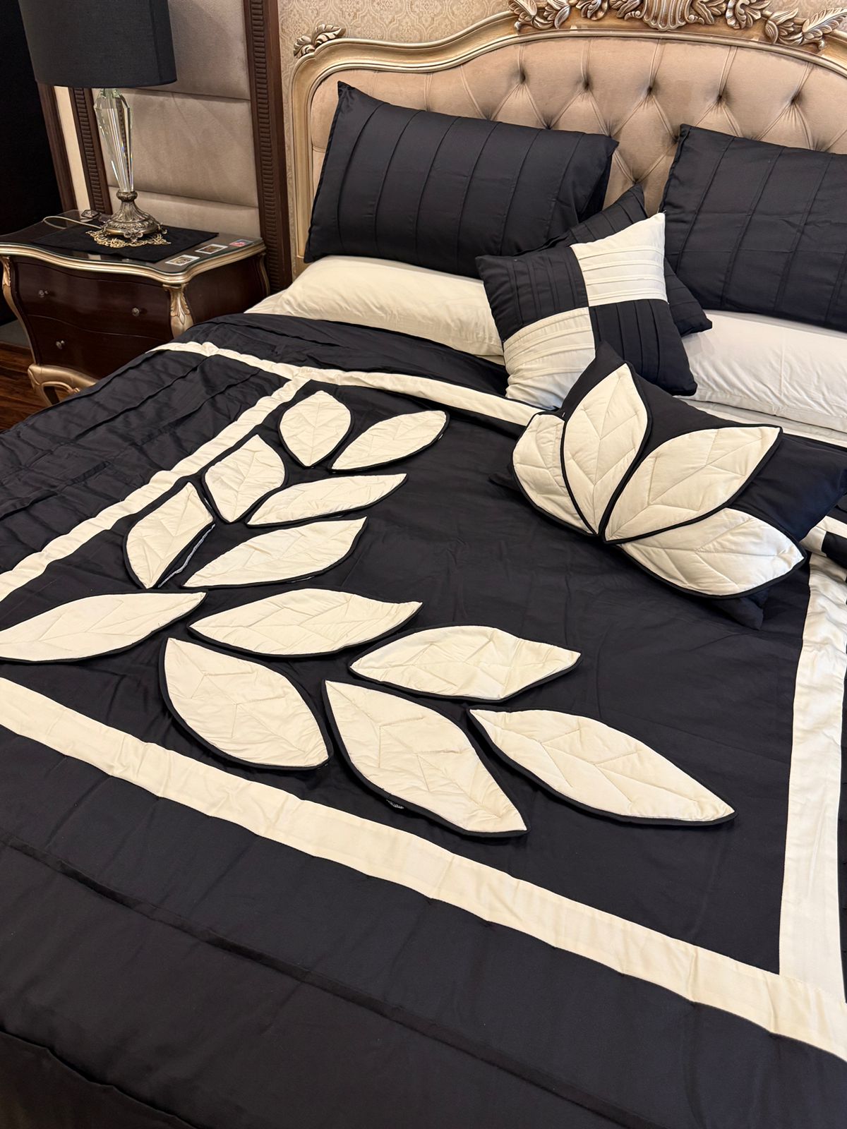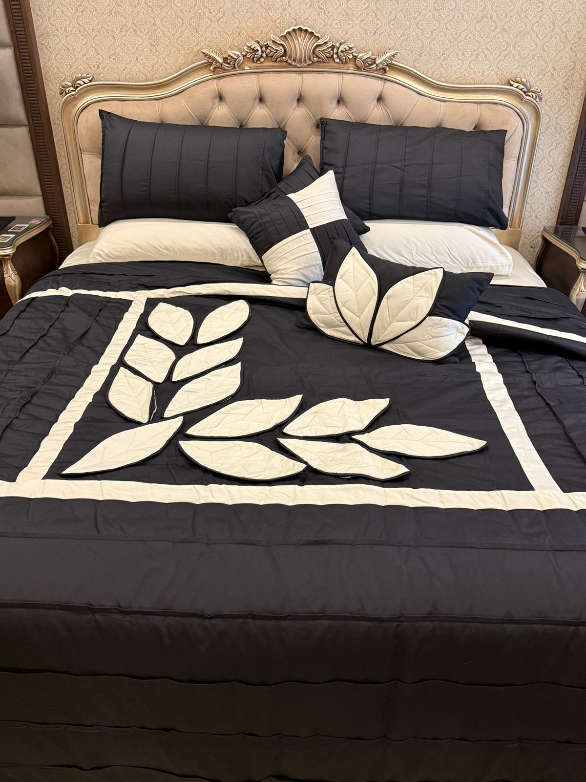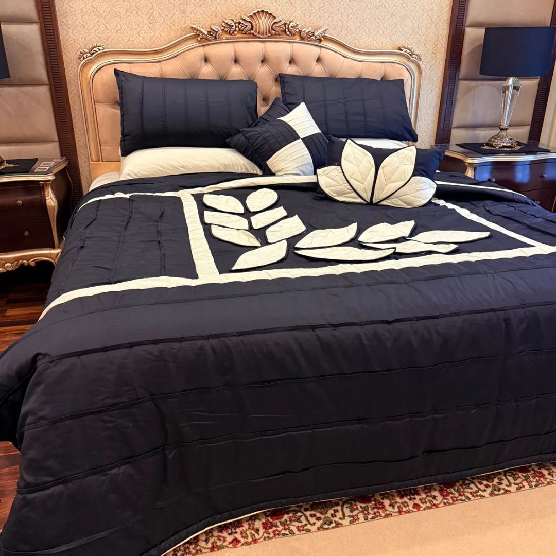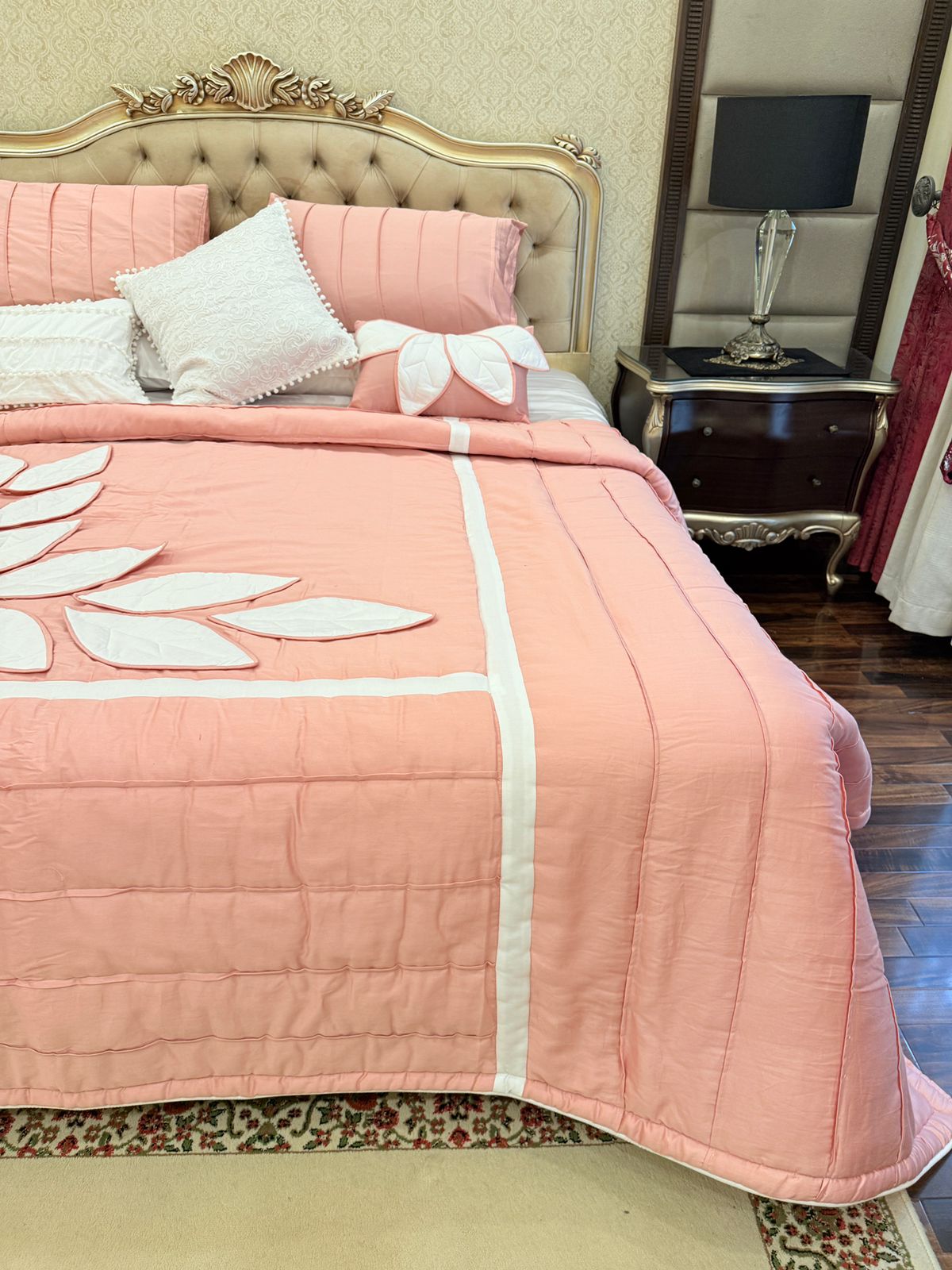 Add a touch of elegance to your bedroom with this handcrafted peach quilted bedspread set, featuring intricate white leaf applique work. Made with care and attention to detail, this set includes matching pillows for a complete and cozy look.