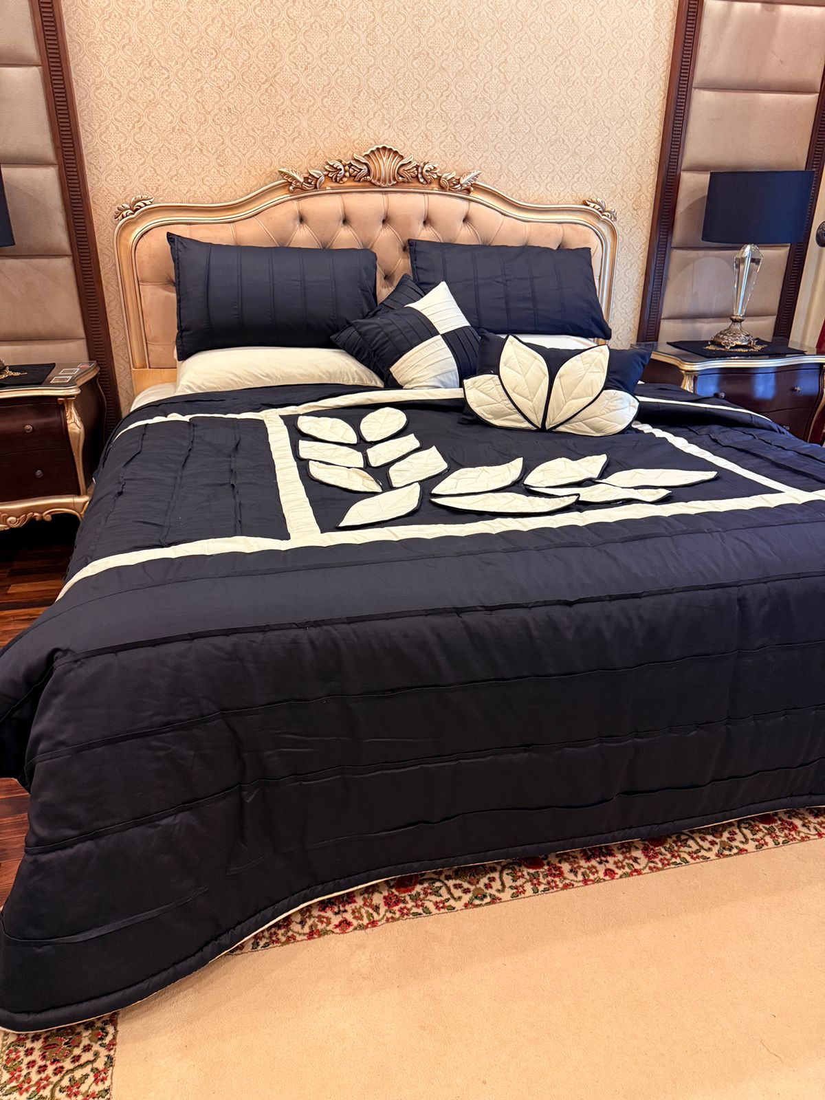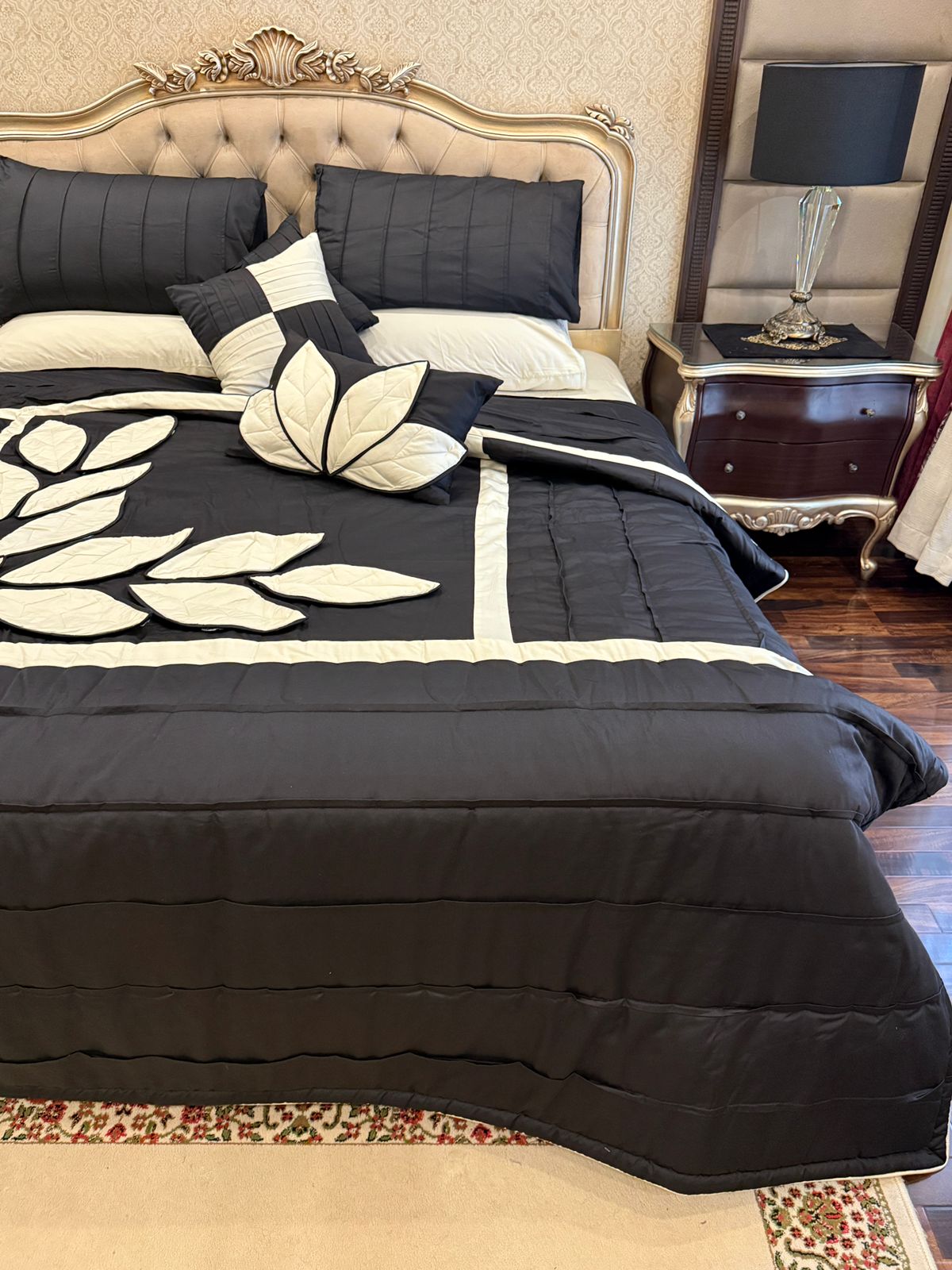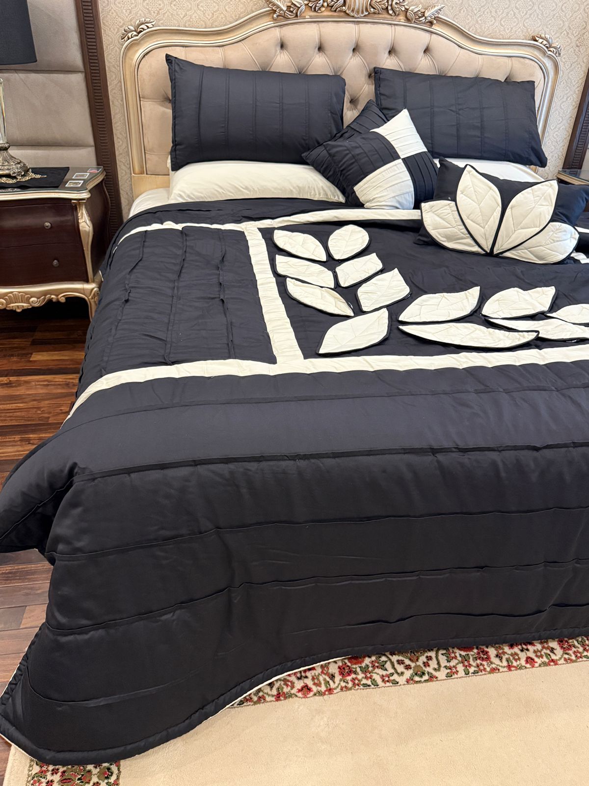 Add a touch of elegance to your bedroom with this handcrafted peach quilted bedspread set, featuring intricate white leaf applique work. Made with care and attention to detail, this set includes matching pillows for a complete and cozy look.
