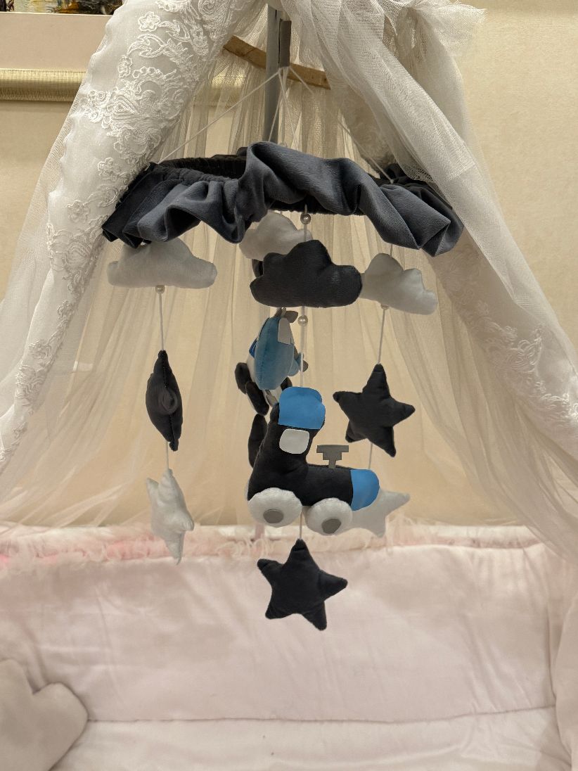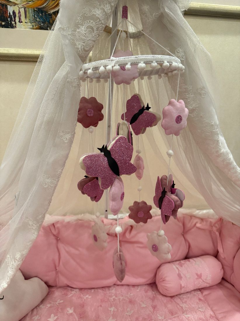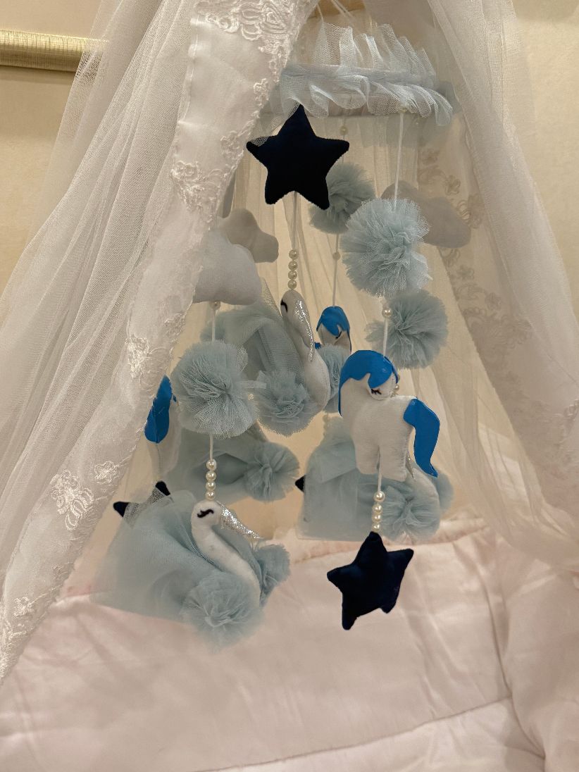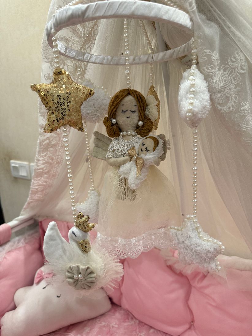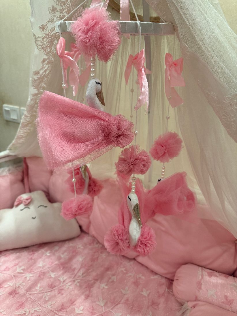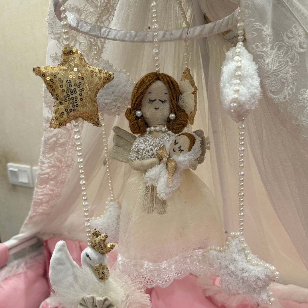 The Dreamy Crib Hanging Collection adds a magical touch to your baby’s nursery. Each handmade mobile features soft plush elements, delicate pearls, and charming characters that style the crib beautifully. Available in multiple variants including Angels, Swans, and Princess themes—perfect for décor and gifting.