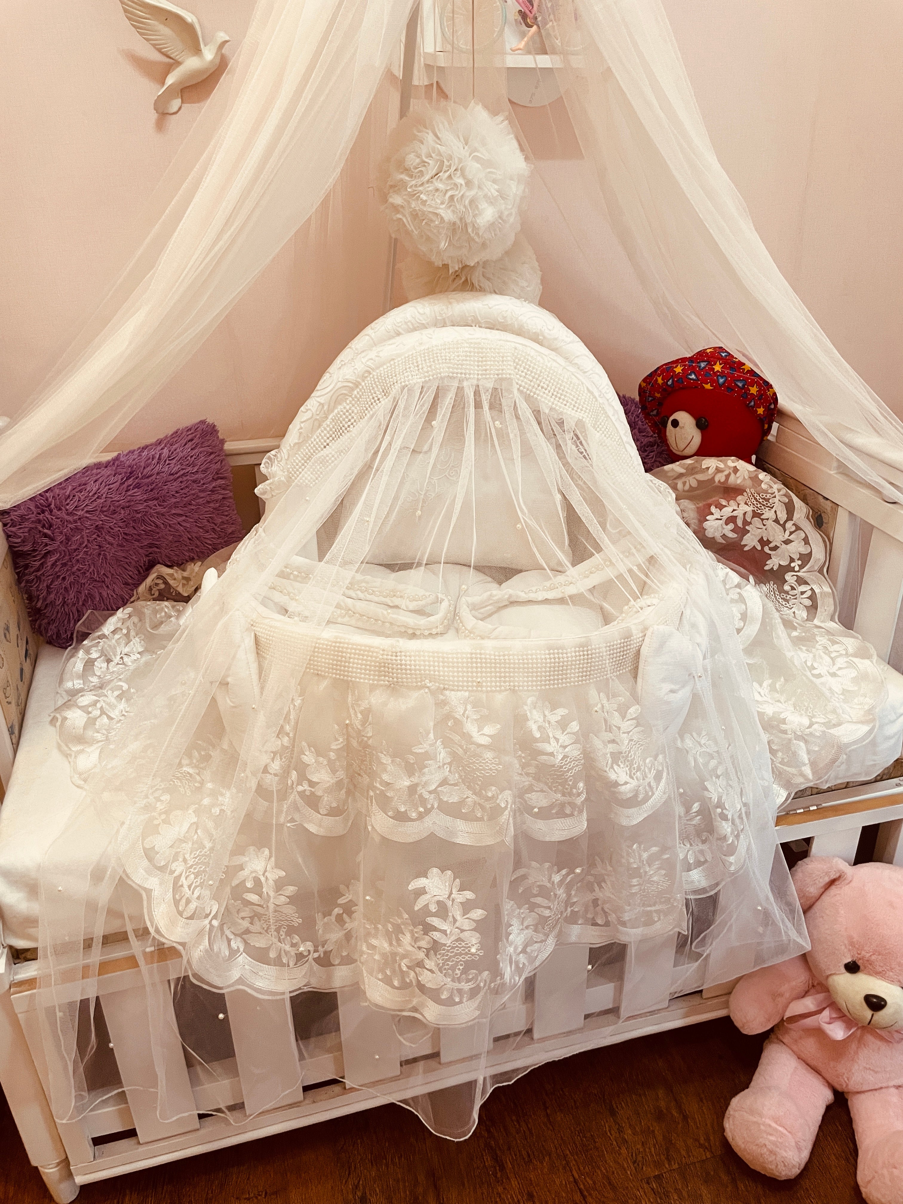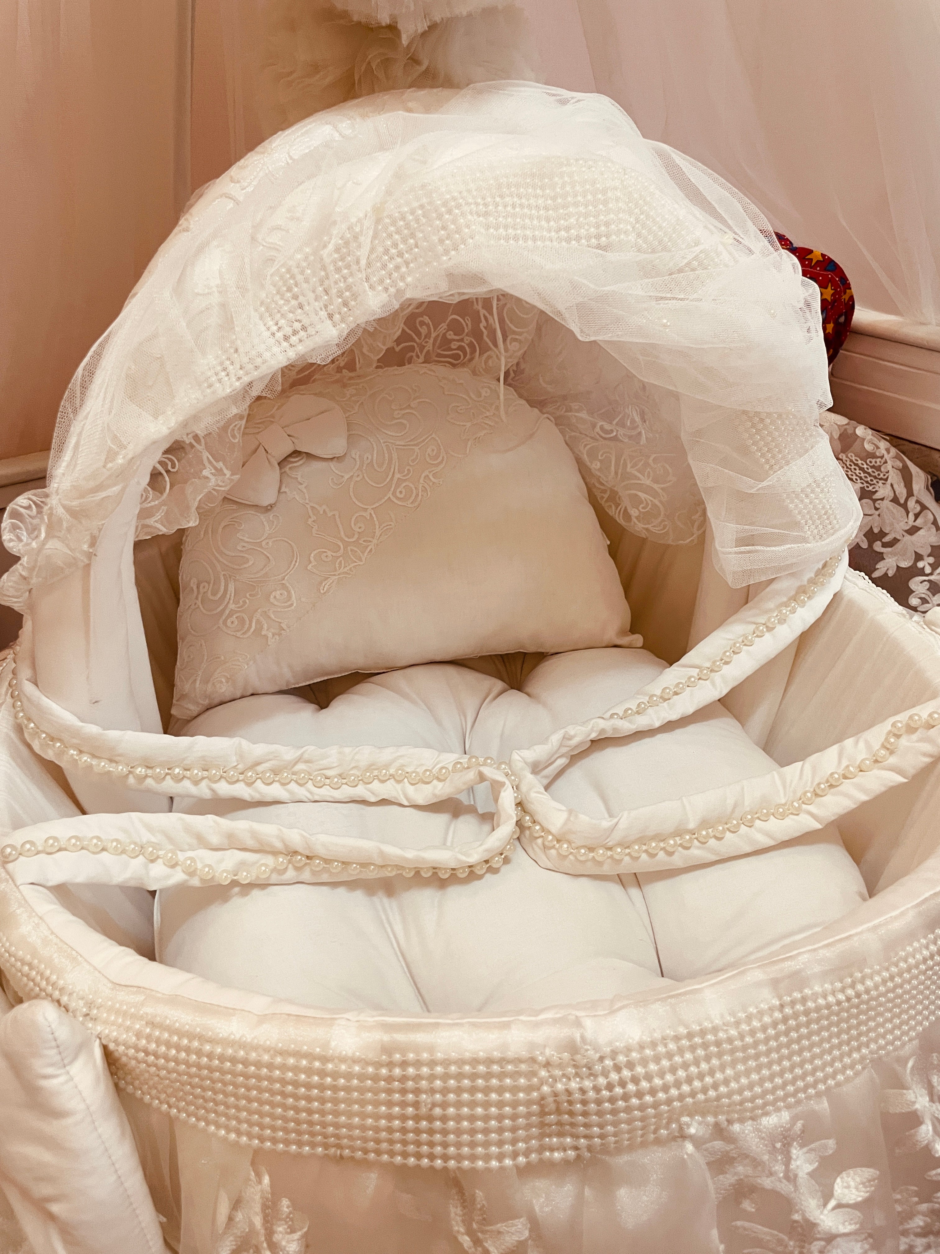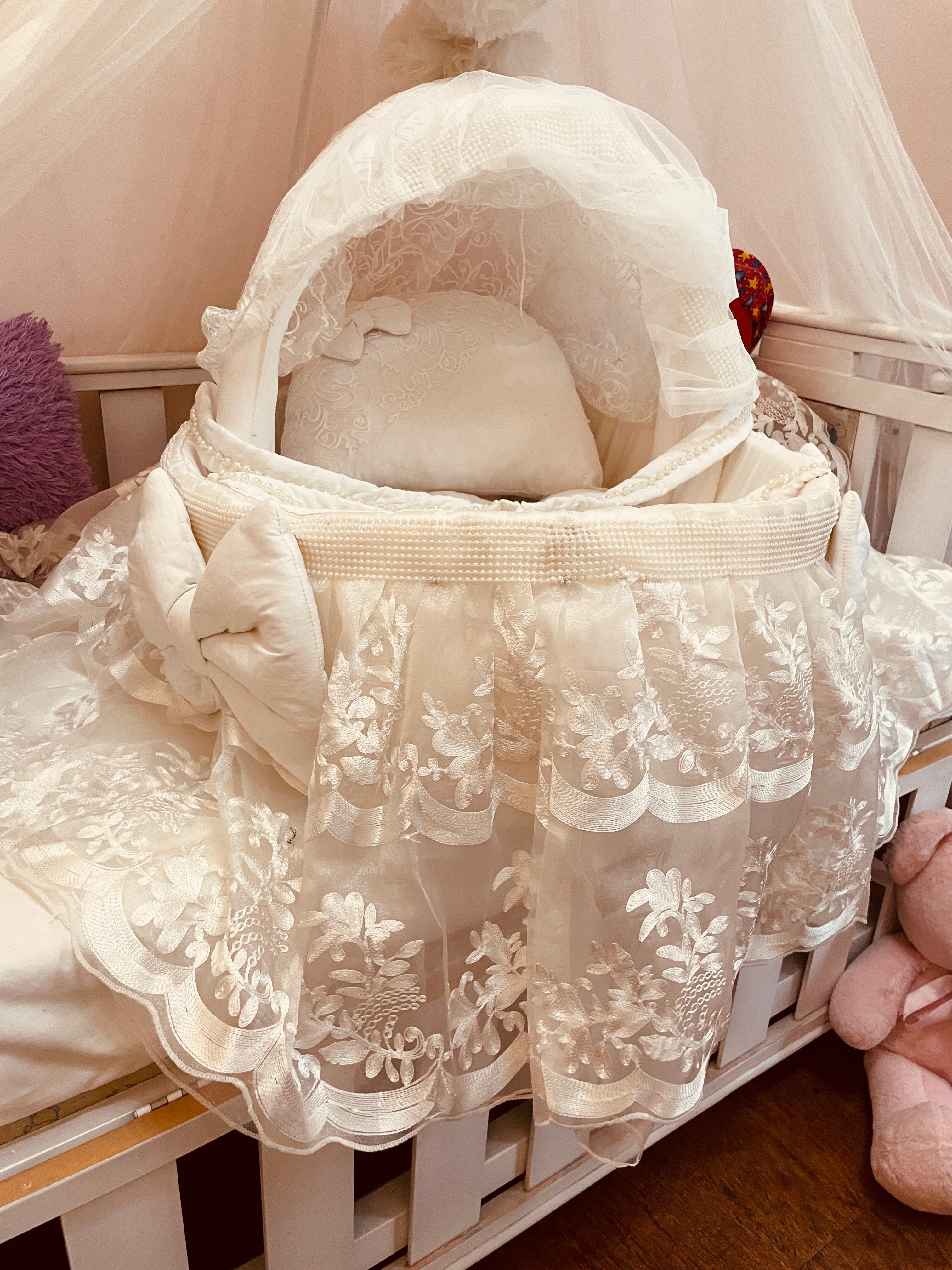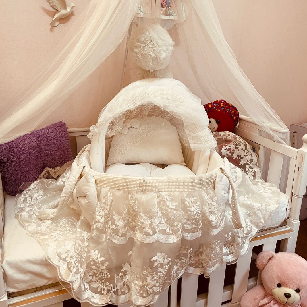 The Lacey Ivory Bassinet is designed to provide a serene and comforting space for your newborn. This baby cot features soft, elegant ivory sautín fabric and is beautifully adorned with intricate floral lace detailing. The set includes a plush head pillow, offering optimal support and softness for your baby's peaceful sleep. Its delicate design and soothing color create a tranquil nursery environment, perfect for your little one. A must-have baby bassinet for newborn essentials and baby bedding.