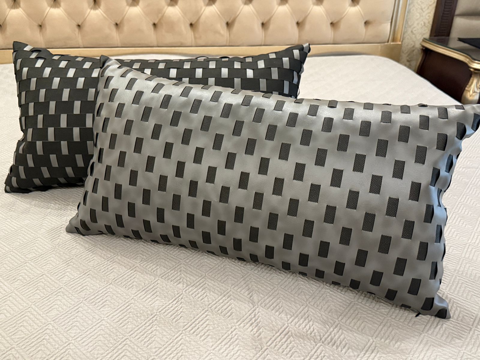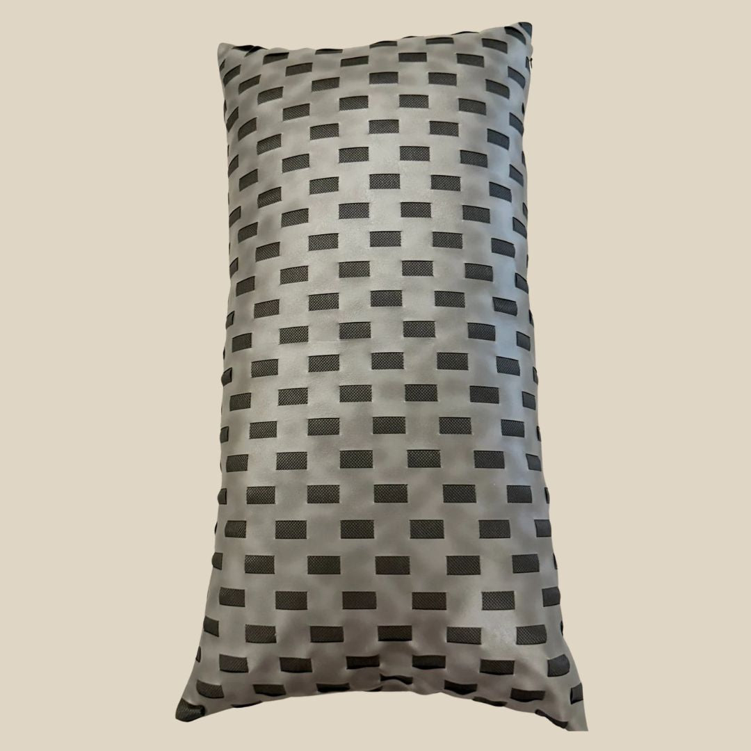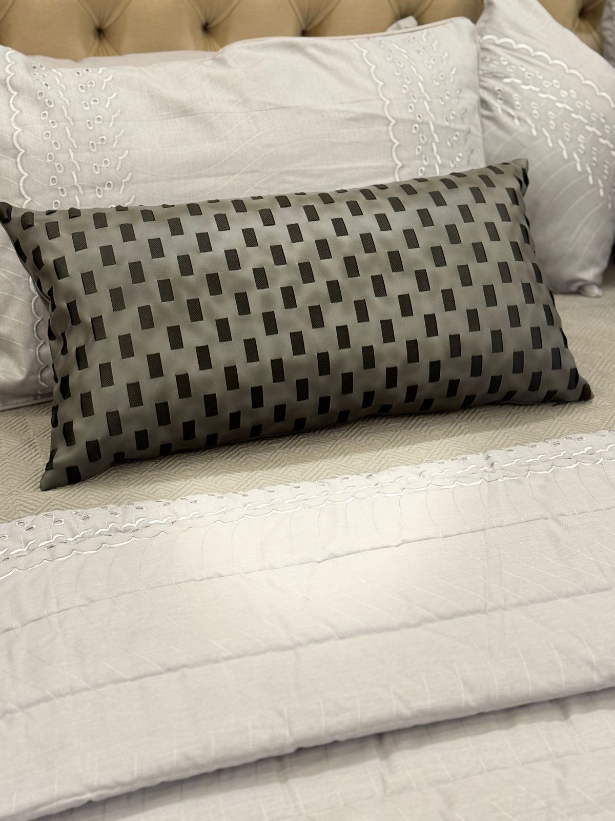 Sleek, sophisticated, and plush—this rectangular velvet cushion adds a contemporary edge to any space. Featuring a soft grey velvet base adorned with a bold black geometric pattern, it offers both comfort and style. Perfect as a statement accent for your bed or sofa.