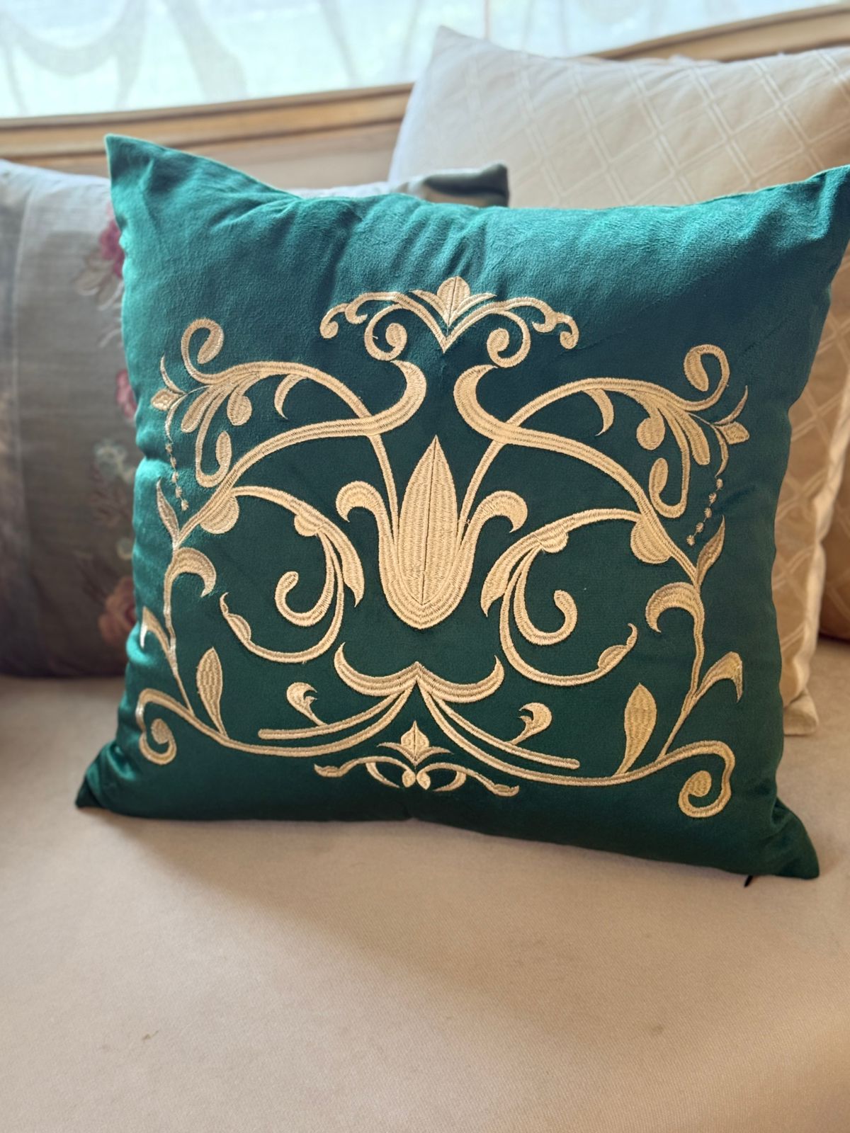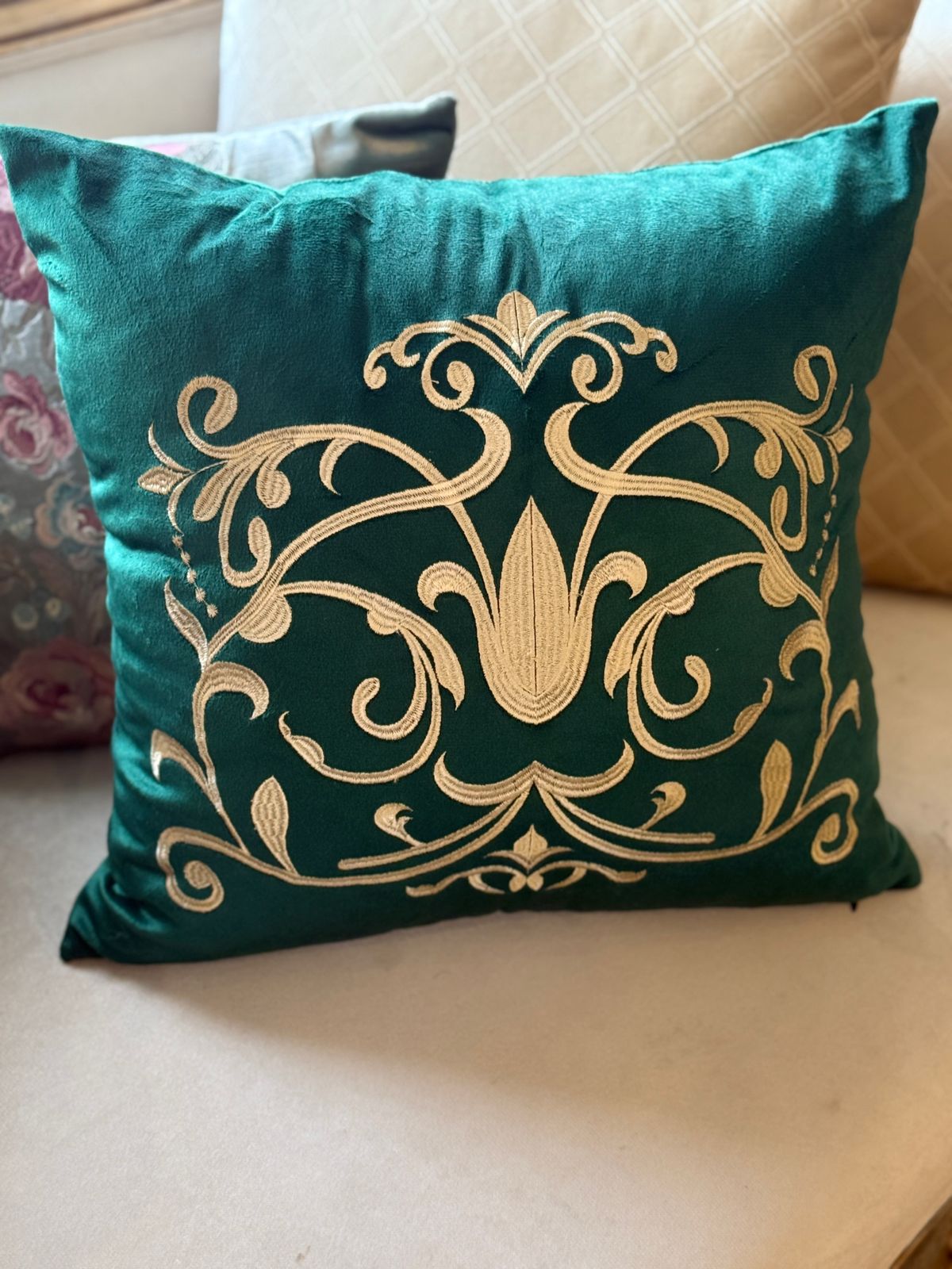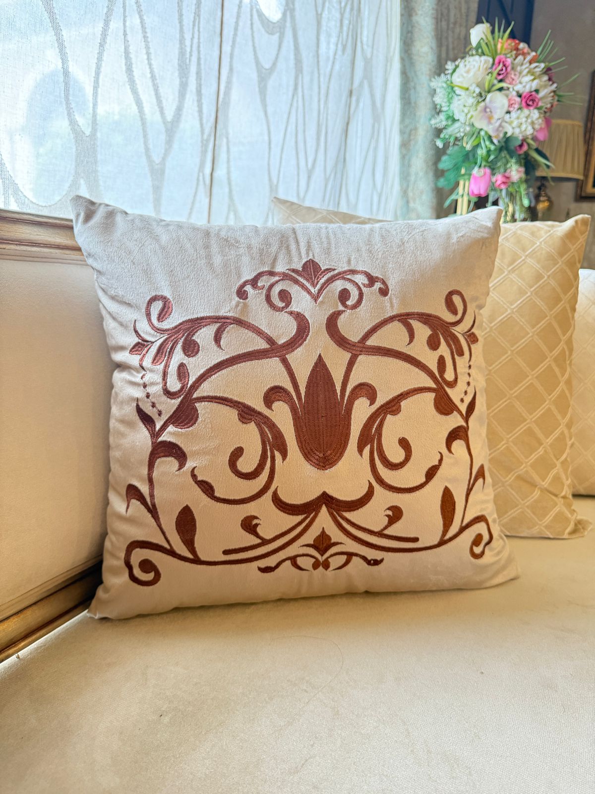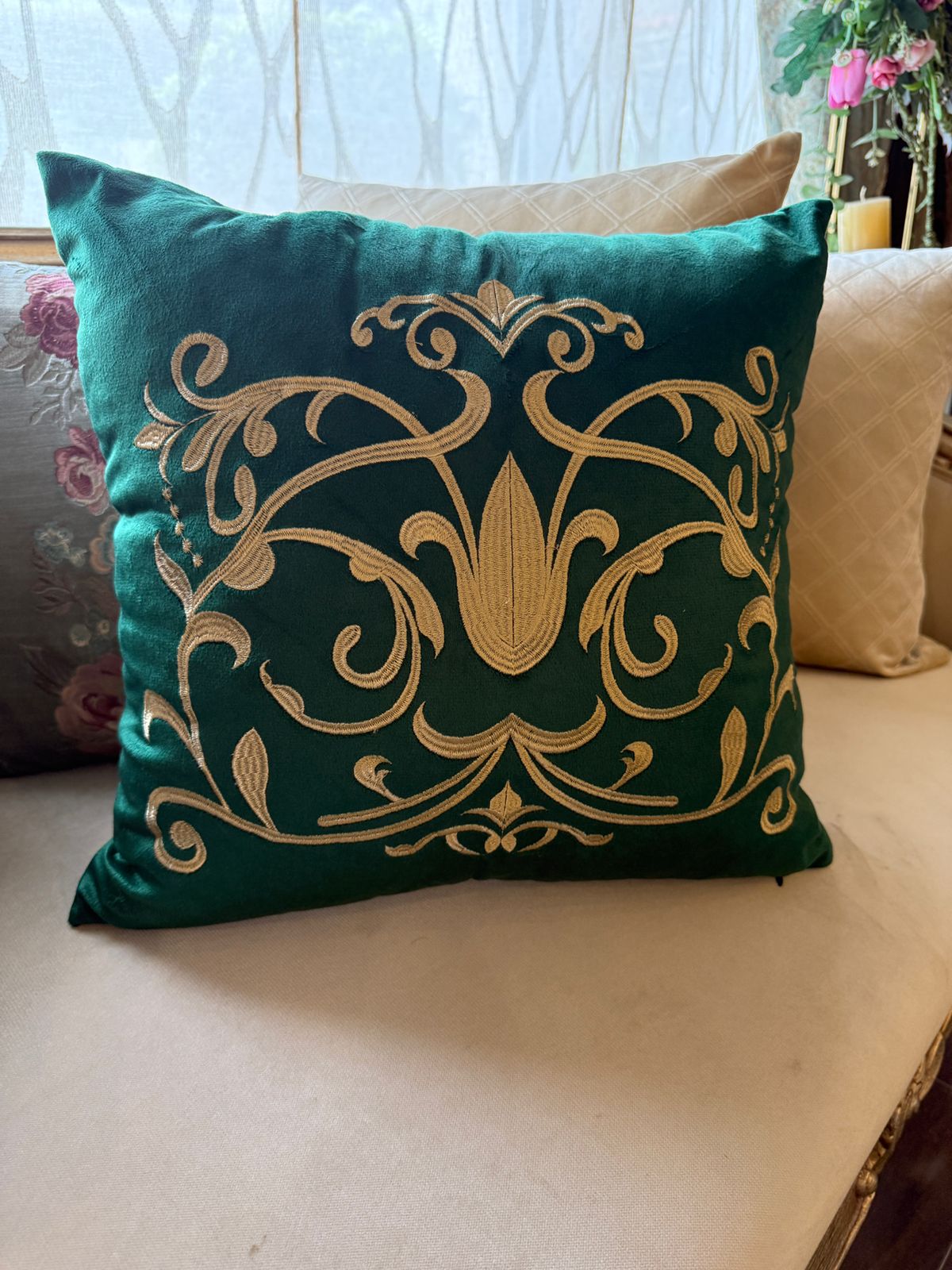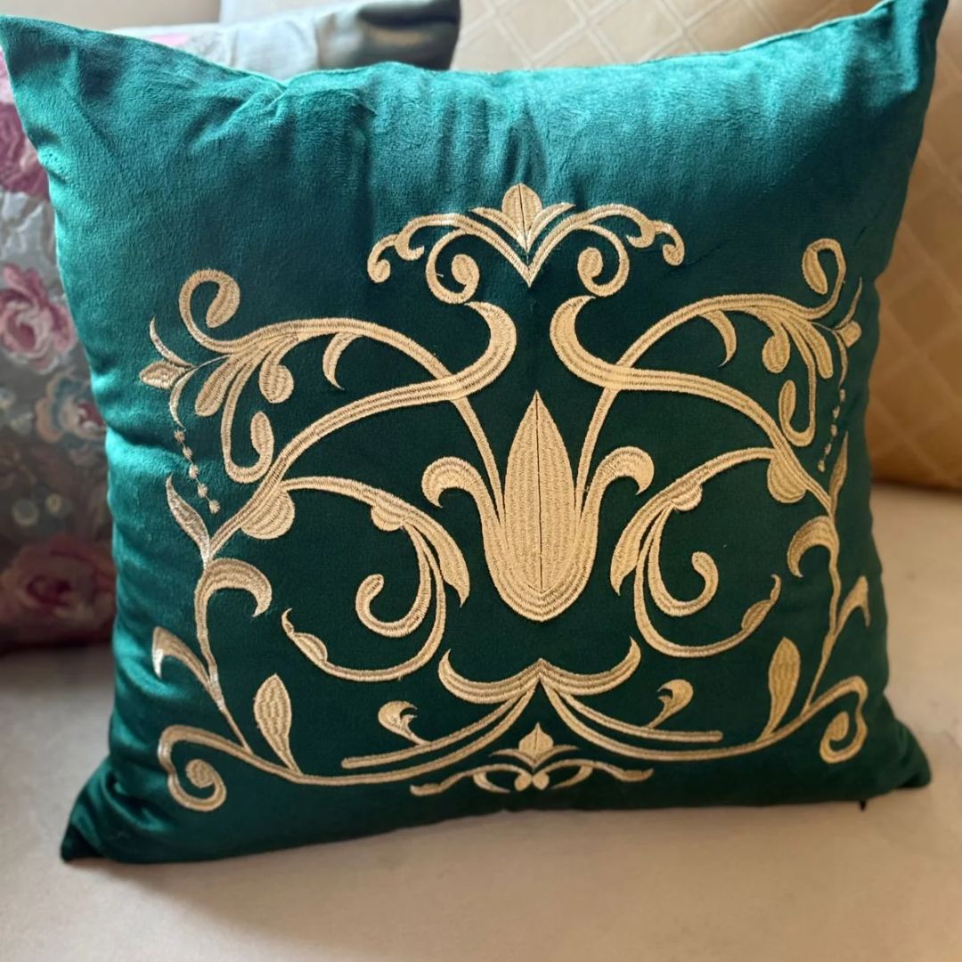Bring luxury and artistry into your home with this beautifully embroidered cushion cover, crafted from soft, rich velvet. Each piece is handmade with delicate embroidery, blending traditional craftsmanship with elegant design—perfect for elevating any sofa, chair, or bedding set.